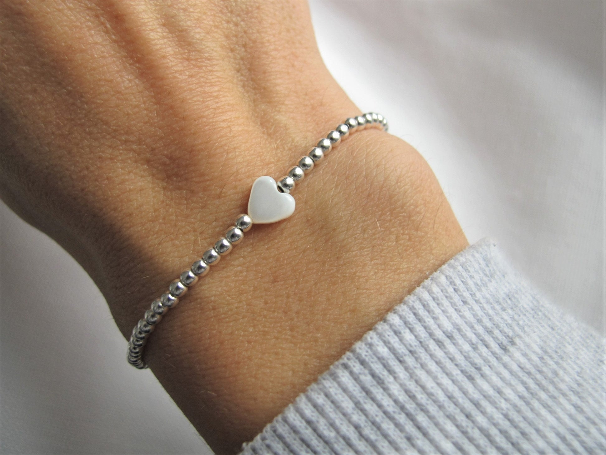 Kugelarmband 925 Silber mit Perlmuttherz | elastisches Perlenarmband